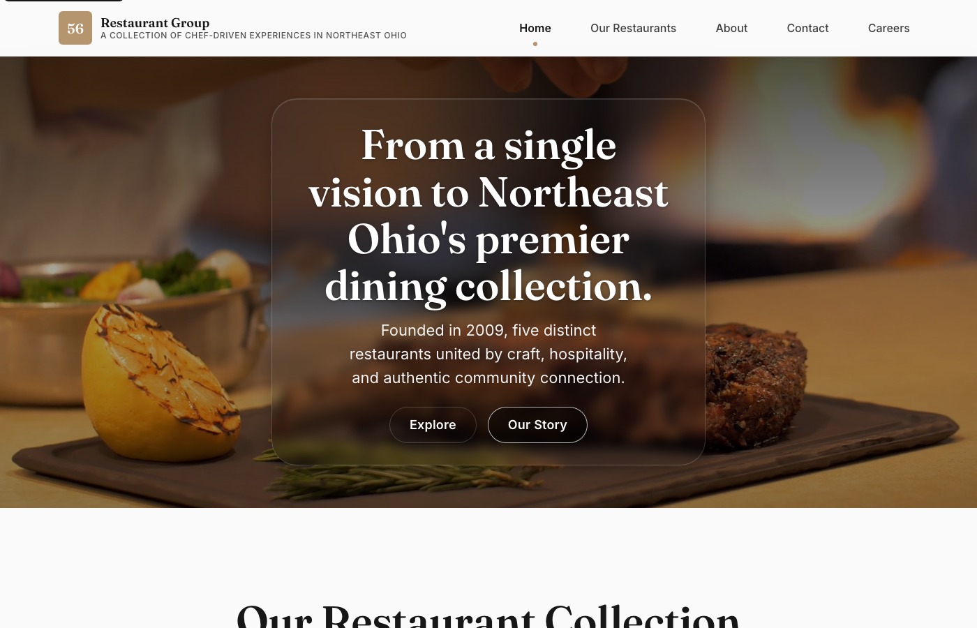 Corporate portal site for Northeast Ohio's premier dining collection, connecting all four restaurant brands under one umbrella with unified branding.