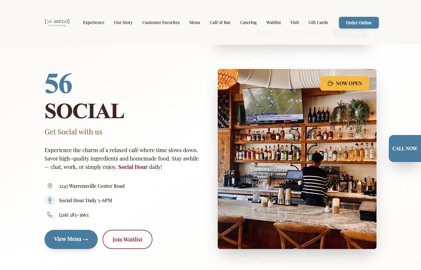 Single-page restaurant site with full café menu, social hour specials, catering section, and reservations.
