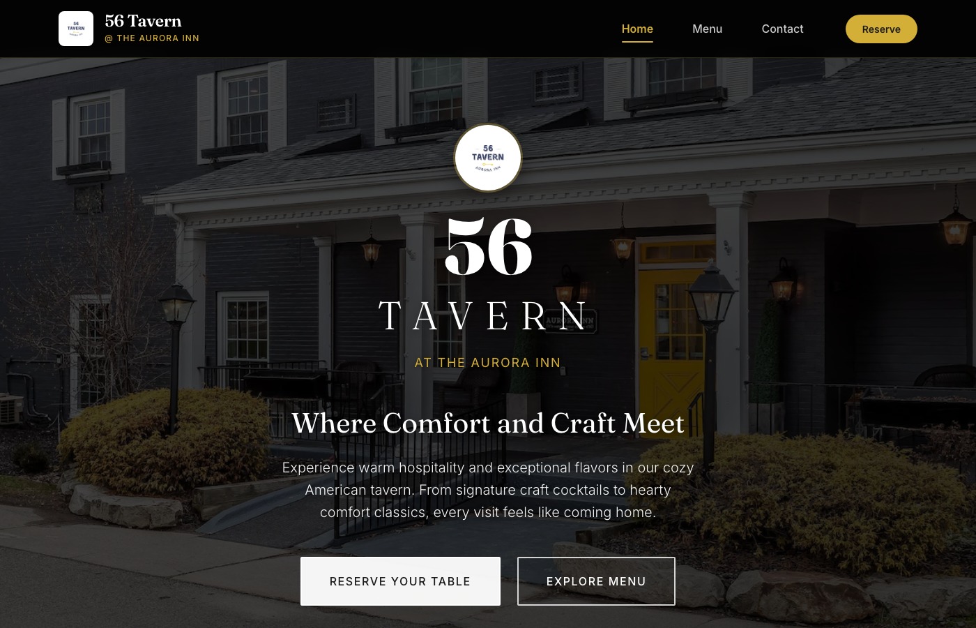 Cozy tavern at the historic Aurora Inn with complete dinner menu, craft cocktails, and reservation integration.