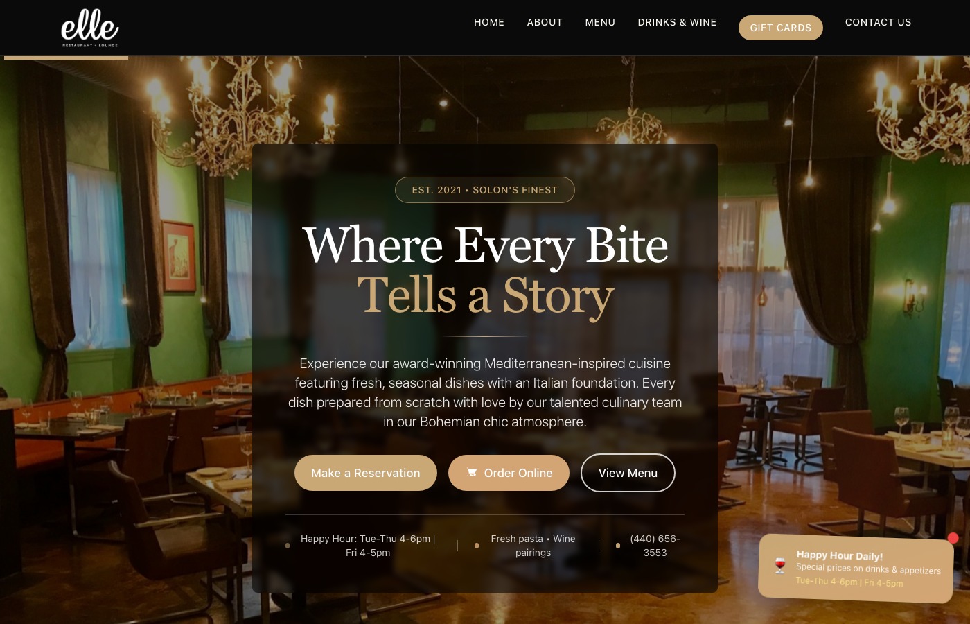 Upscale Mediterranean restaurant with dinner menu, cocktail list, wine program, and reservations. Migrated from WordPress.